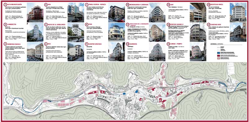 Este mapa es otro de los pasos realizados a favor del turismo industrial de Eibar. Este proyecto refleja el rico patrimonio industrial de la ciudad armera, ligado a su arquitectura industrial única. El mapa muestra la ubicación del edificio y su actividad económica. Además, en el reverso del mapa se ha elaborado un collage con los antiguos logos y productos de estas empresas, bien conocidas para la ciudadanía